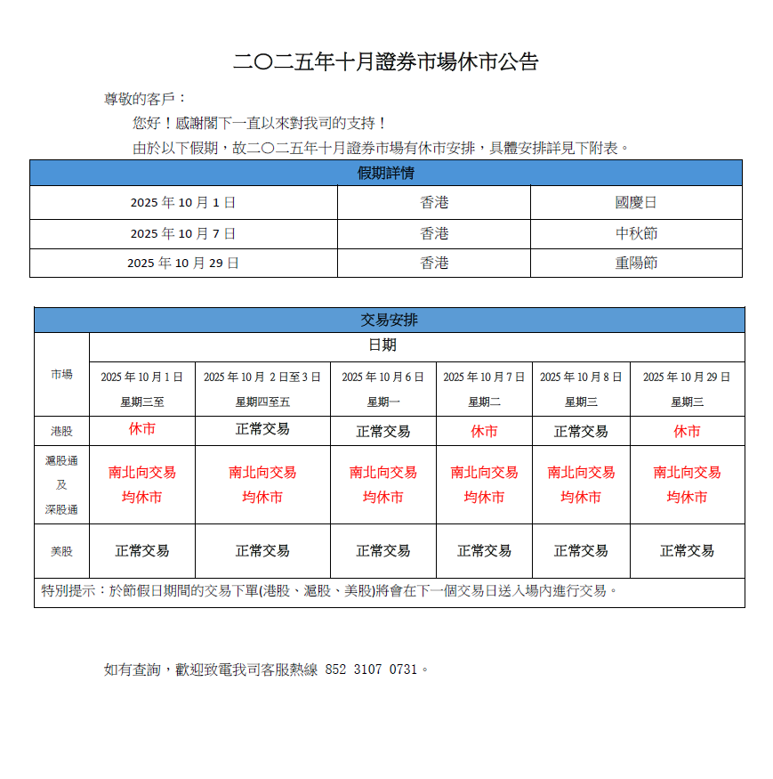 【證券】二〇二五年十月證券市場休市公告